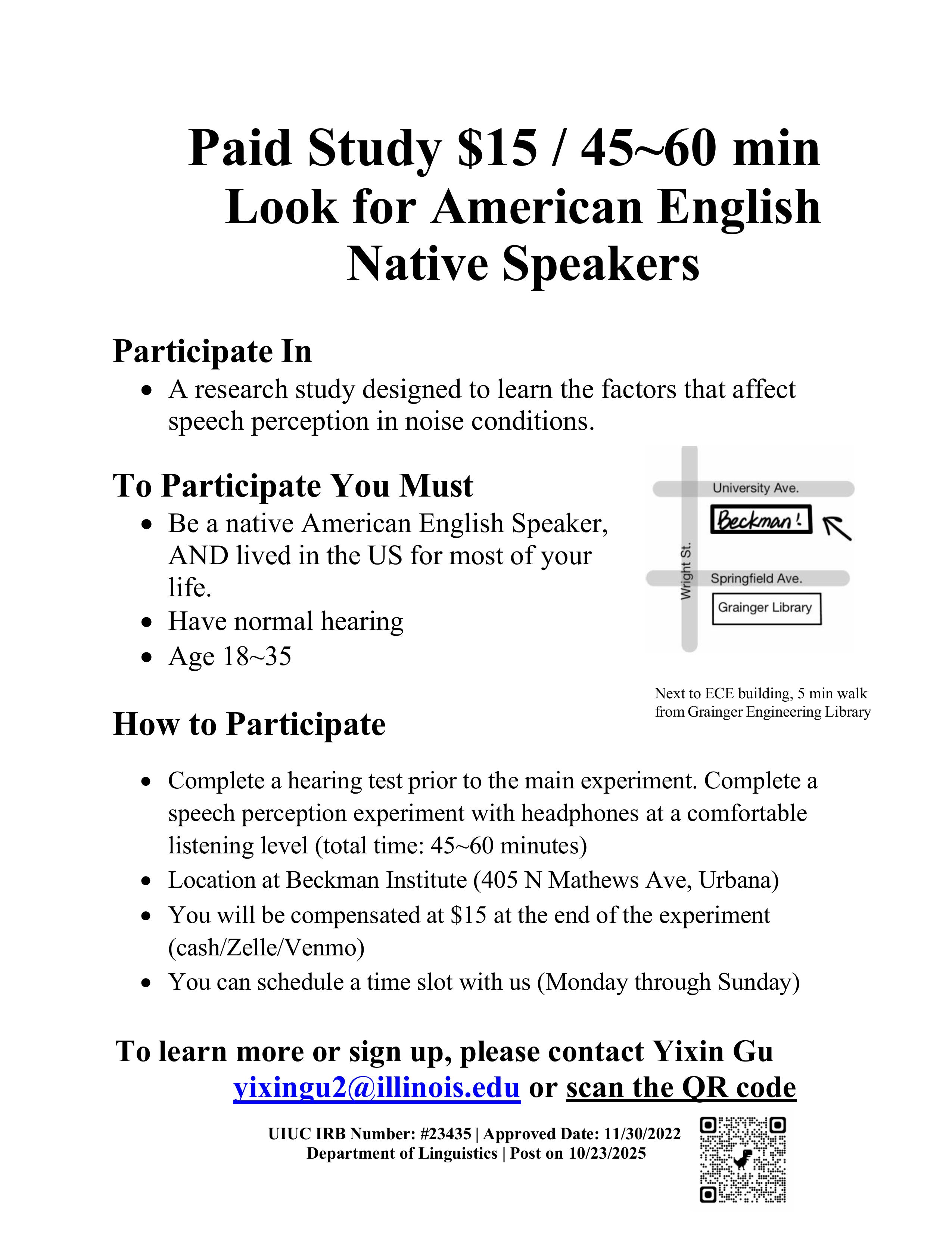 Description: We’re recruiting native American English speakers who age 18-35 with normal hearing for a study on speech perception in noise. The session includes a brief hearing check, short questionnaires, and a headphone-based listening task. Total time is about 60 minutes and participants receive $15 upon completion (cash/Zelle/Venmo). Sessions are held in-person at the Beckman Institute Room 2412 (405 N Mathews Ave, Urbana).